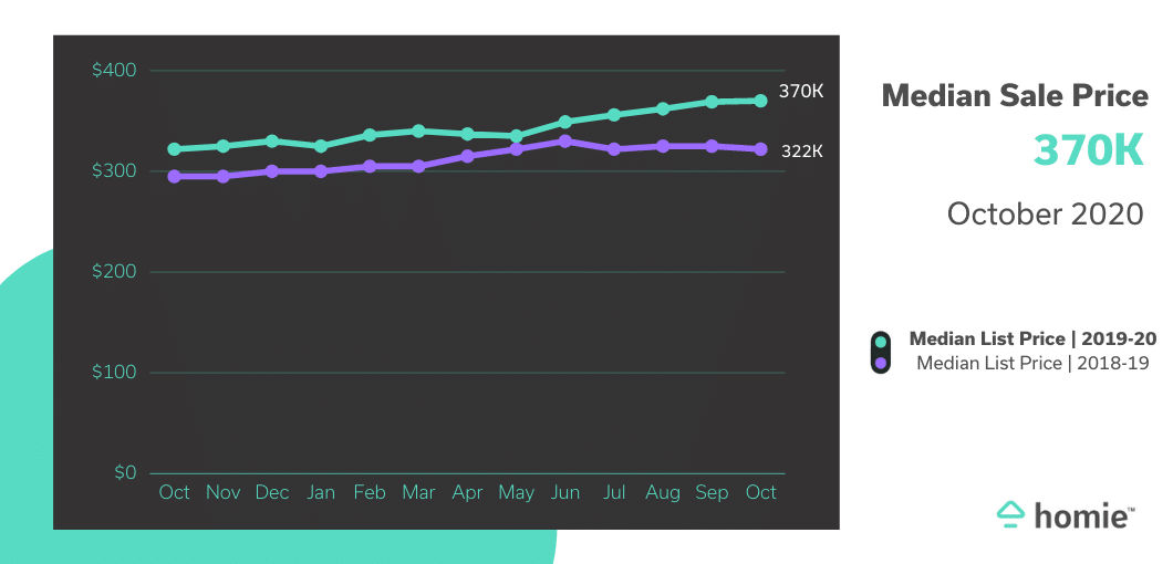 At $370K, Utah’s sale median sale prices are sitting slightly higher than the median list price. This number is $50K, or +15.6%, higher than sale prices in October 2019.