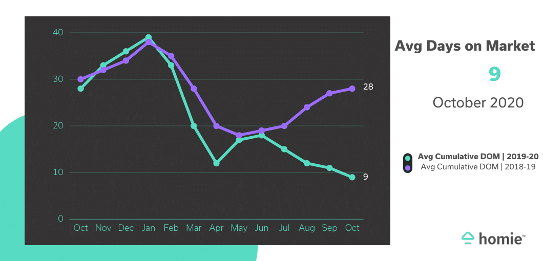 Homes in Utah are flying off the market faster and faster all the time. October’s average number of Days on the Market was 9. The previous month’s average DOM was 11, while October of 2019 had an average of 29. This is a whopping -69% decrease. If you’re looking to buy a house, you’ll need to move faster than before.